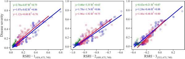 Spearman相关曲线显示,RSRD的严重程度在红色区域最可量化。此外,所有生长阶段在NIR区域都出现了一致的相关性。基于这些特征,分别从红色和NIR区域选择了两个波段作为构建RSRI方程的部分。红色区域的*优波段分别为抽穗阶段的680nm和开花及灌浆阶段的675nm(图4)。NIR区域最敏感的波段为751nm、743nm和734nm。因此,确定了红色区域的共同波段675nm和NIR区域中位波长740nm来填充RSRI方程。RSRI的第三个波段从抽穗阶段的剩余代表性波段中选择,包括454nm、489nm和553nm。构建了三个候选指数,分别命名为RSRI-1、RSRI-2和RSRI-3,以进行进一步比较。