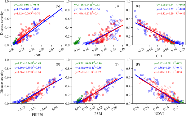 图6. DS(疾病严重度)与SIs(光谱指数)之间的关系,包括回归线和R²值。绿色、蓝色和红色的正方形分别代表抽穗、开花和灌浆阶段的样本。除了RSRI-3(553,675,740)与抽穗阶段DS之间的关系(p值=0.133)外,所有回归都具有统计学意义(p值<0.001)