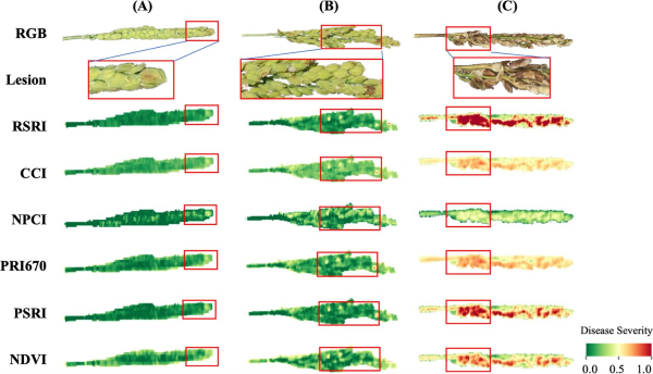 本研究确定了多个生长阶段对RSRD的光谱响应差异,并构建了一个新的指数RSRI,该指数对多个物候阶段的RSRD敏感。结果表明,灌浆阶段绿色和近红外区域的反射率对DS的敏感性显著低于开花阶段。RSRI的优化表明,蓝色波段的加入提高了抽穗阶段SI对DS的敏感性,增强了早期疾病检测能力。与NPCI、CCI、PRI670、PSRI和NDVI相比,RSRI在早期感染阶段对DS的敏感性最高,并且从抽穗到灌浆阶段在DS估计中表现最为稳定(抽穗:R² = 0.65,RMSE = 0.02;开花:R²= 0.84,RMSE = 0.08;灌浆:R²= 0.78,RMSE = 0.08)。此外,基于RSRI的模型比之前研究的SIs更能准确地映射轻微、轻度和严重感染样本的病斑分布。RSRI在早期感染阶段的DS估计和病斑映射可以为作物保护和病理学研究提供有效的参考。