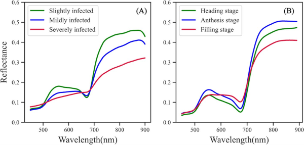 图11. A.开花阶段三种不同RSRD严重度稻穗的反射光谱。B.代表与本研究无关的三种健康水稻稻穗在抽穗、开花和灌浆阶段的反射光谱