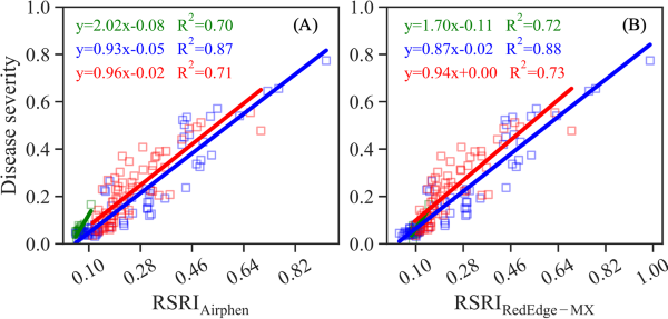 图12.展示了三个生长阶段(A)Airphen和(B)RedEdge-MX模拟数据的DS-RSRI关系。绿色、蓝色和红色正方形分别代表抽穗、开花和灌浆阶段的样本。RSRI是通过参考Airphen或RedEdge-MX的带宽和中心波长,从高光谱数据立方体模拟的多光谱反射率计算得出的。将454nm、675nm和740nm的波段分别替换为每个传感器的蓝色、红色和近红外波段。所有回归均具有统计学意义(p值<0.001)