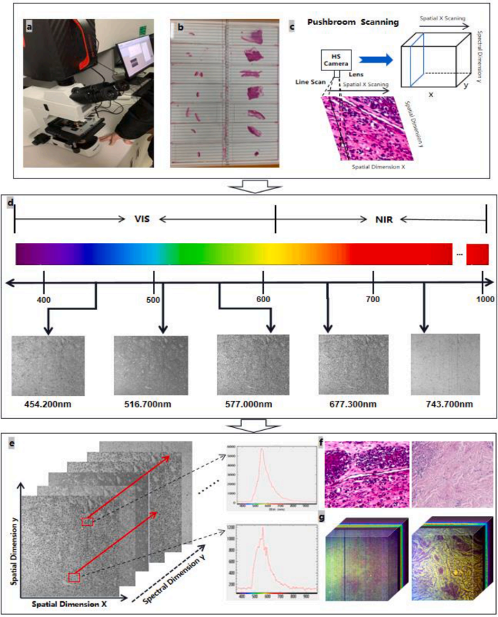 图1. (a) 用于获取高光谱图像的设备。(b) 一些黑色素瘤和色素痣样本。(c) 在高光谱相机上的扫描模式。(d) 从黑色素瘤(CMM)患者处获取的不同波长的高光谱图像。(e) 高光谱图像数据立方体。(f) 肿瘤组织样本(CMM)和色素痣样本的组织病理学图像。(g) 病理高光谱图像。