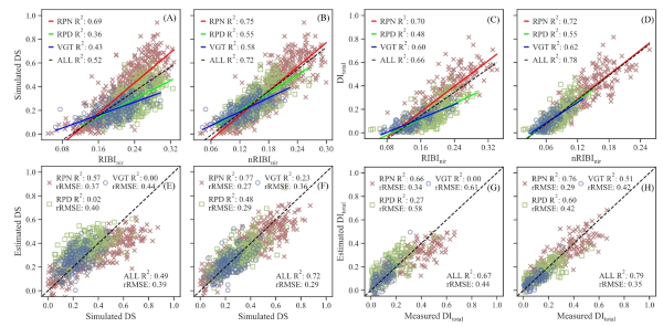 为此,研究提出了基于VOG1植被指数的归一化修正方法——nRIBInir指数,能够有效消*叶绿素对RIBI的干扰,使得稻瘟病严重度估算的R²由0.67提升至0.79,rRMSE降低9%,尤其在轻度感染样本中精度提升最为显著。