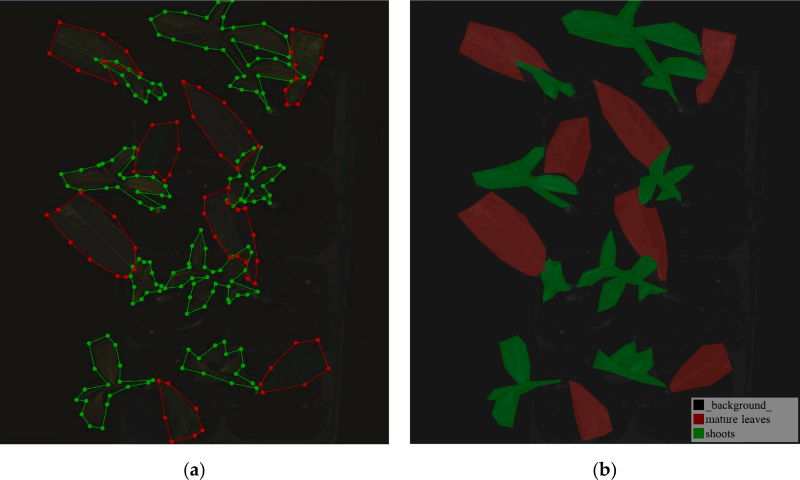 图2. 标注图像 (a) 标注成熟叶片和茎叶的图像;(b) 标注完成的成熟叶片和茎叶图像
