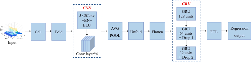 在模型的建立方面,构建了卷积神经网络与门控循环单元(CNN-GRU)网络模型和传统机器学习模型。CNN-GRU模型网络结构如图4所示。首先,为了更好地提取数据的底层特征,使用CNN来提取数据特征。然后,数据被输入到一个5×5的滤波器中进行卷积。经过4次卷积、平均池化、序列扩展和展平后,数据被输入到GRU网络中。在这里,一维光谱数据与茎叶和根系生物量数据被GRU网络结合,用于回归预测。此外,在CNN网络中,步长为1,填充为“same”(填充值由算法根据卷积核大小内部计算),输入数据通道为1。经过3次门控循环后,预测数据被输入到全连接层,并通过回归器输出。