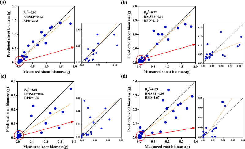 图5. 原始光谱与MSC、1D和S-G预处理后的光谱对比。(a) 茎叶光谱 + 茎叶生物量;(b) 茎叶光谱 + 根系生物量;(c) 成熟叶片光谱 + 茎叶生物量;(d) 成熟叶片光谱 + 根系生物量。