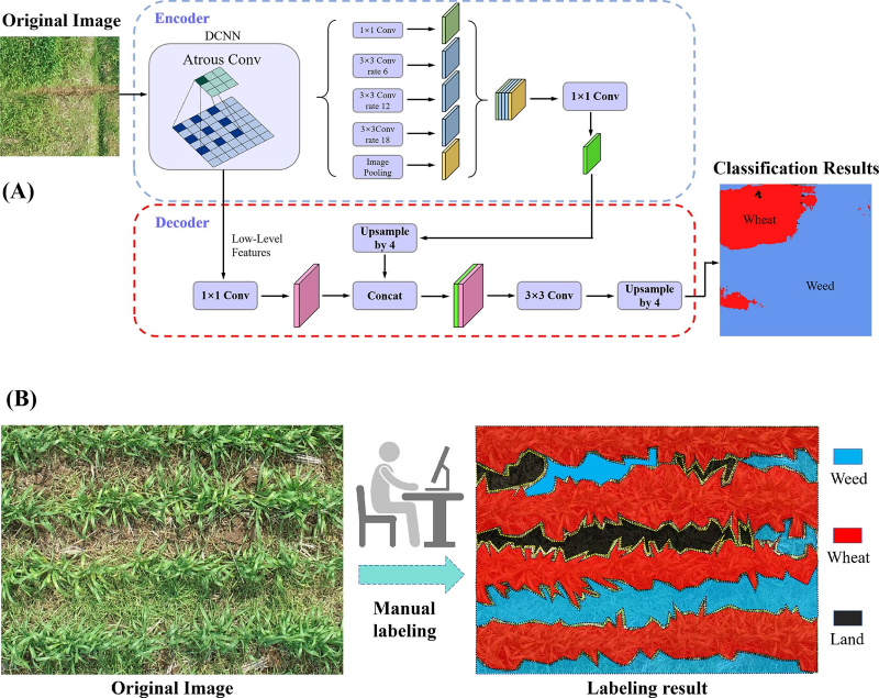 图3深度学习技术实现杂草覆盖提取(A)深度学习网络结构;(B)标注流程及结果。如图3B所示:红色标注区域代表小麦,蓝色表示杂草,黑色为土壤。