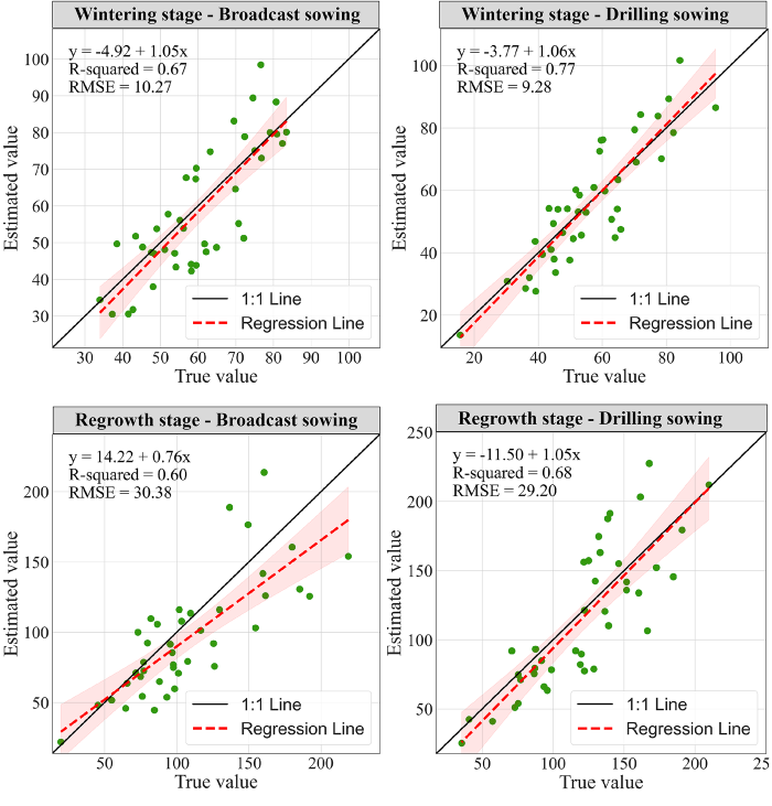 尽管单一植被指数在区分上受限,研究发现部分波段组合的 NDVI 与小麦/杂草生物量存在*高相关性(相关系数 >0.92),例如冬季小麦*佳组合为 (960 nm, 733 nm),冬季杂草为 (960 nm, 719 nm),拨节期亦存在相应的高相关组合。这提示利用恰当的波段组合可以为生物量估算提供有力的光谱特征。基于此,研究将冠层覆盖(CC)与若干植被指数作为输入变量,使用支持向量回归(SVR)建立杂草生物量估算模型。模型建模阶段总体表现良好(建模 R² 均 >0.85):冬季估算精度最高,训练阶段 RMSE 常低于 8 kg·ha⁻¹;但在返青/再生期由于小麦群体增大且混合像元影响增强,建模精度有所下降,RMSE 可上升但通常不超过 20 kg·ha⁻¹。独立验证显示性能存在波动——总体平均验证 RMSE 约 40.03 kg·ha⁻¹;其中钻播冬季表现*佳(验证 RMSE ≈ 9.28 kg·ha⁻¹),而散播返青情形最差(验证 R² ≈ 0.6,RMSE ≈ 30.38 kg·ha⁻¹)。影响精度的主要因素包括:语义分割无法精细量化杂草密度导致 CC 估计偏差、小麦对植被指数的干扰(尤其在返青期)以及田块间播种方式与密度差异。因此,推荐将语义分割的空间定位与基于优选波段的光谱回归相结合,并针对播种方式与生育期进行专门校准,以获得更稳定的生物量估算结果。