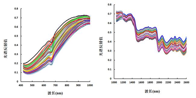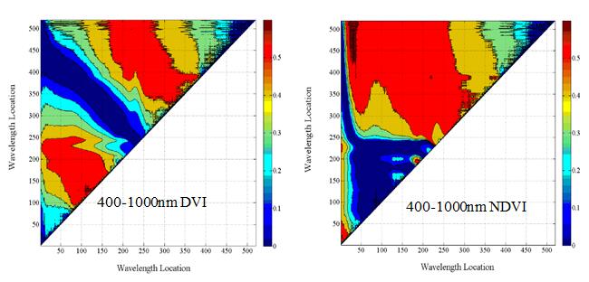 本研究使用的成像高光谱仪V10E范围是400-1000nm,N25E-SWIR范围是1000-2500 nm,通过不同波段的重新组合,形成不同形式的光谱指数(归一化光谱指数,NDVI;差值光谱指数,DSI)。
