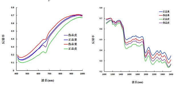 本试验采用的V10E 相机获取的是400-1000 nm波长范围共520个波段的可见/近红外光谱数据,N25E-SWIR相机获取的是1000-2500 nm波长范围共288个波段的近红外光谱数据,全部样本的原始光谱图如图 2所示,正品皮、伪品皮、正品果、伪品果的光谱比较图如图3所示。