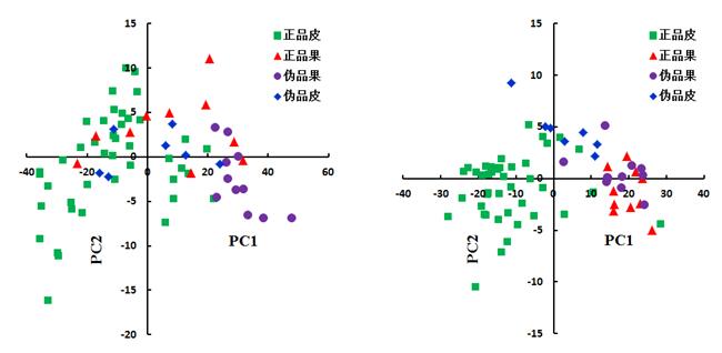 由图 4 可知,在400-1000 nm与1000-2500 nm范围内,各不同成分之间较难直接区分出来,得分图中均有重合的地方。从图5亦可以看出无论是400-1000 nm或1000-2500 nm,主成分的成分组合均未能完全从正品皮、伪品皮、正品果、伪品果四种样本中识别出正品皮,从图5可知,识别出的正品皮亦有假的正品皮。因此需要对光谱数据进行进一步的分析和处理,以鉴别化橘红不同成分。
