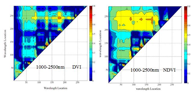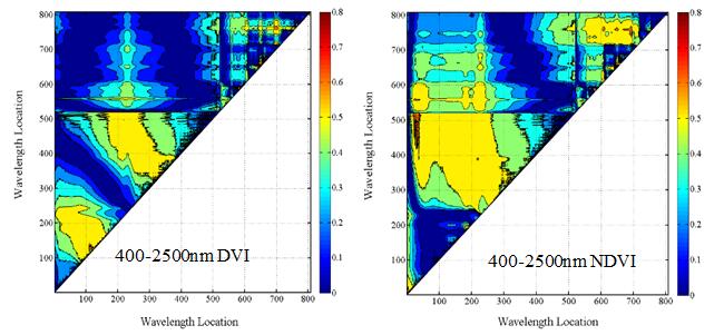 两组数据构建NDVIDVI模型时,NDVIDVI两个光谱指数模型决定系数最高的两波段组合与1000-2500 nm范围内相同。比较400-1000 nm1000-2500 nm的决定系数图可知,在1000-2500 nm范围内,NDVIDVI构建的模型决定系数较高。