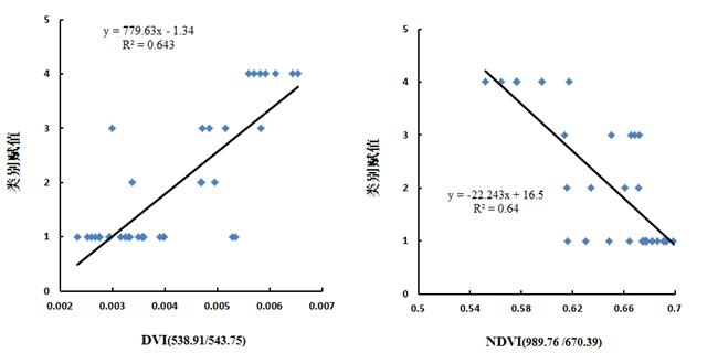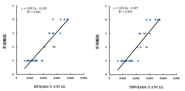 根据图6可知,在400-1000 nm范围内,DVI(538.91/543.75)NDVI(989.76/670.39)与类别赋值构建的模型决定系数最高,分别为0.6430.640。在1000-2500 nm范围内,DVI(1820.72 /1787.12)NDVI(1820.72 /1787.12)与类别赋值构建的模型决定系数最高,分别为0.8610.834。图7分别为DVI(538.91/543.75)NDVI(989.76/670.39) DVI(1820.72 /1787.12)NDVI(1820.72 /1787.12)与类别赋值的线性拟合散点分布图,从图中可知,在1000-2500 nm范围内构建的NDVIDVI光谱指数与类别赋值拟合度最高,且变化曲线显著。