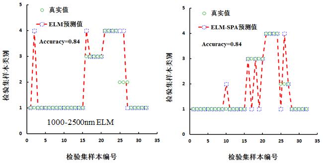 分别将建模集合检验集的全波段光谱及特征波长光谱作为极限学习机的输入变量,从而获取预测样本类别的赋值。图10为检验集与预测值的类别赋值图,并针对图10进行总体识别精度、正品皮识别精度、  正品皮识别错误率的统计,如表5所示。从表5中可知,总体识别精度、正品皮识别精度最高的均为在1000-2500 nm范围内的ELMELM-SPA构建的模型,分别是84%95%,正品皮识别错误率最低的则为1000-2500 nm范围内的ELMELM-SPA 构建的模型,均为5%。从表5可知,在400-1000 nm范围内,基于特征波段光谱的ELM模型总体识别率与正品皮识别率均高于基于全波段的ELM模型,对于正品皮的识别错误率,基于全波段与基于特征波段的错误识别率相同;在1000-2500 nm范围内,无论是基于全波段光谱或基于特征波段的ELM模型,其总体识别率、正品皮识别率、正品皮识别错误率均相同,分别为84%95%5%