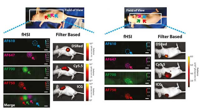 图2A 麻醉裸鼠四种染料试制的分布/ 图2B 四种染料试制混合注射到裸鼠体内观测试制分布