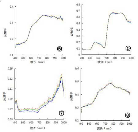 为了进一步验证高光谱影像拼接结果的有效性,本文提取了拼接结果重叠区域中典型地物(如植被、土壤、房屋等)的8个采样点的光谱反射率及拼接前2景图像对应位置的光谱反射率进行对比分析,这8个采样点的光谱反射率曲线如图3所示。图3中第一条光谱和第二条光谱代表的是拼接前2景图像重叠区相同位置的光谱反射率,未匀色和匀色分别代表的是未匀色和匀色拼接图像相应位置的光谱反射率。从图3可知,反射率较高的地物,其拼接前后的光谱重叠率较高,如第三类和第六类地物;而反射率较低的地物,其拼接前后的光谱差异较大,如第七类地物所示。总体而言拼接前后高光谱图像的光谱反射率曲线相似度非常高,拼接后其光谱反射率曲线保留了未拼接前高光谱图像的反射率曲线的大部分信息。