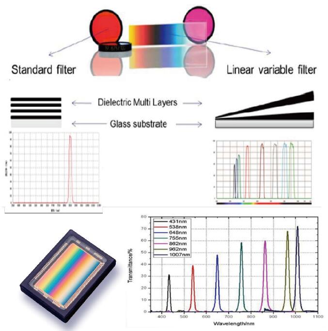 高光谱成像技术具有多波段(可达上百个波段)、波段窄(≤ 10-2λ)、光谱范围广(200-2500nm)和图谱合一等特点。优势在于采集到的图像信息量丰富,识别度较高和数据描述模型多。由于物体的反射光谱具有“指纹”效应,不同物不同谱,同物一定同谱的原理来分辨不同的物质信息。物体的光谱特性与其内在的理化学特性紧密相关,由于物质成分和结构的差异就造成物质内部对不同波长光子的选择性吸收和发射。完整而连续的光谱曲线可以更好地反映不同物质间这种内在的微观差异,这也正是成像光谱技术实现地物精细探测的物理基础。 渐变薄膜式高光谱相机是将不同波段的渐变薄膜镶镀在面阵探测器上, 可同时、快速获取光谱和影像信息的无损检测分析仪器。
