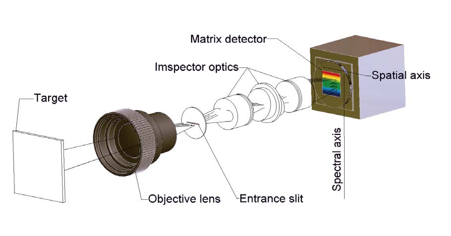 基本工作原理:入射狭缝(Entrance Slit)位于准直系统的前焦面上,样品(Target)的入射光经准直光学系统准直后,进过棱镜- 光栅- 棱镜色散后有成像系统将光能按波长顺序成像在探测器的不同位置上。然后在垂直于狭缝方向使被测物与狭缝实现一维相对运动,得到被测物的二维空间信息与光谱信息,得到高光谱数据立方体,而结合多通道光纤束则无需机械扫描运动结构,方可实现对多点目标光谱的实时监测。