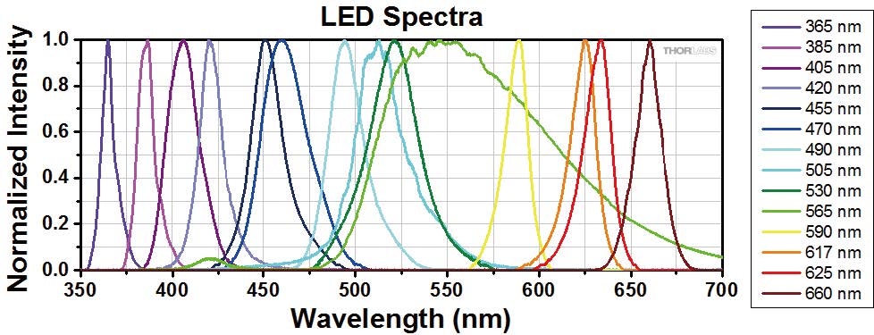 四波长高功率LED 光源(ThORLABS) 适用于需要多达4 个波长光源的应用。与传统的非LED 光源( 如卤素灯和气体放电灯) 相比,这些四波长光源具有许多优势,例如更高的信噪比( 由于窄带宽发射)、更好的稳定性、更长的使用寿命、更低的更换成本、无需循环维护的简单操作、以及无需主动冷却或热过滤( 由于最小化热负载)。